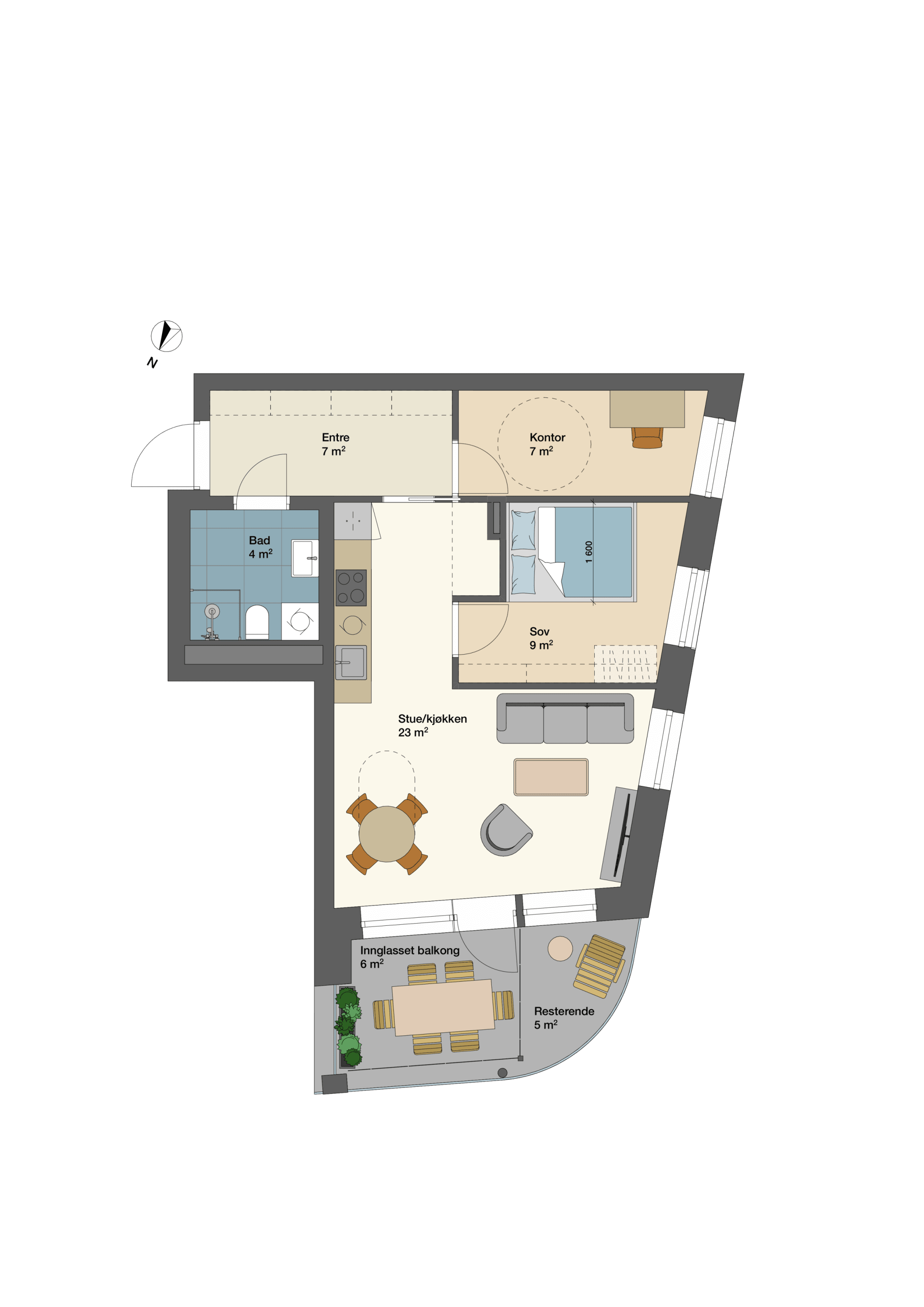 En plasseffektiv leilighet med åpen stue/kjøkkenløsning, ett soverom, ett kontor, ett bad og balkong.