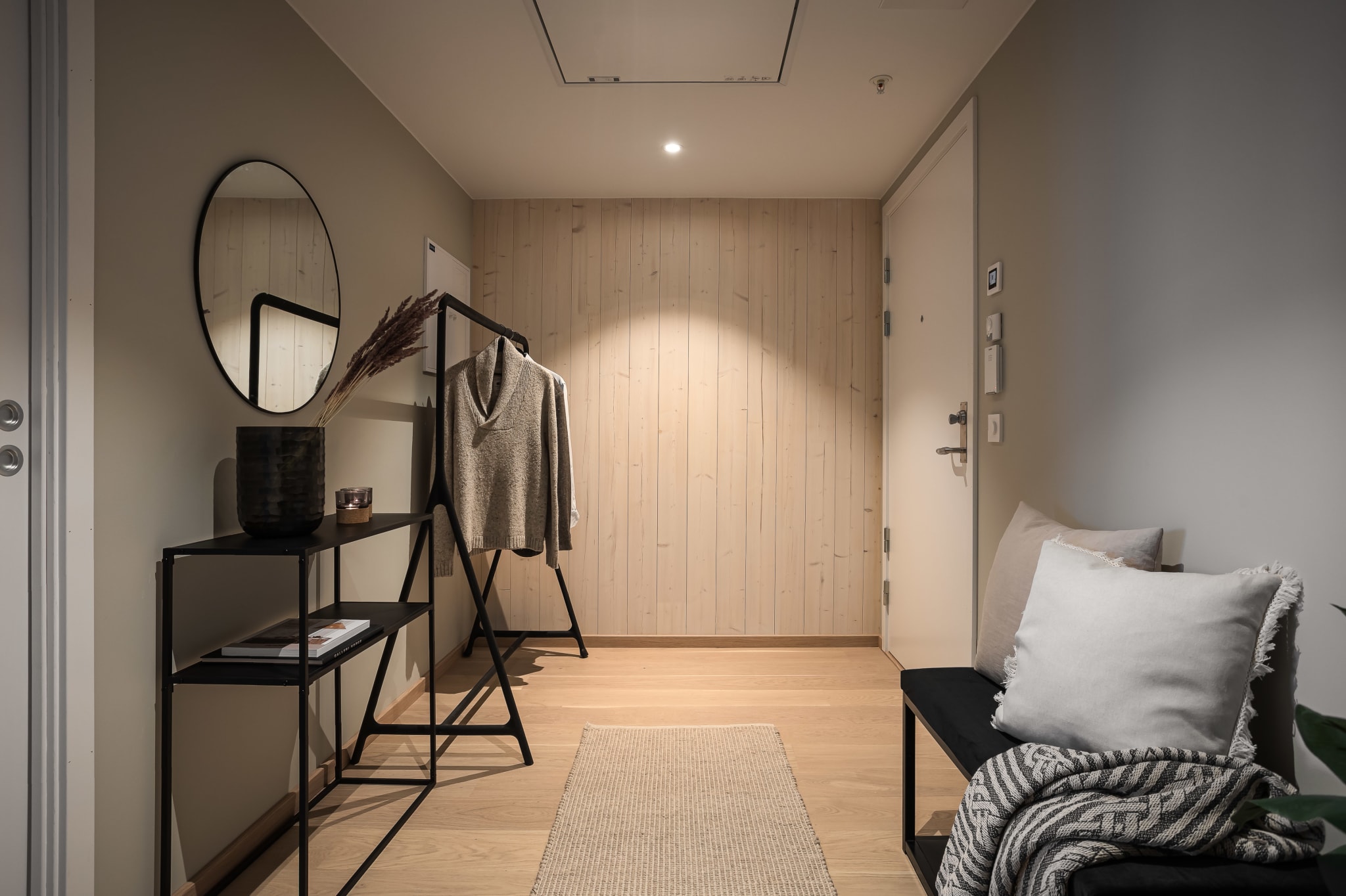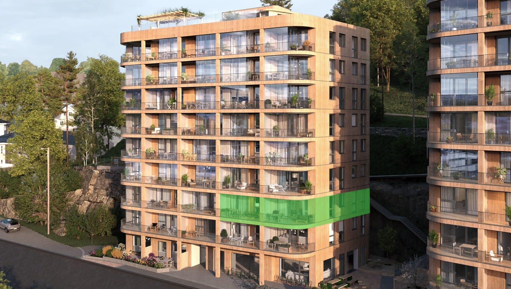 I Fyrstikkbakken 14 får du tilgang til 250 kvm møblerte og fiks ferdige fellesfasiliteter som selskapslokale, gjesteleiligheter, sauna på takterrassen, treningsrom og smart parkering for bil og sykkel. Alt dette, som vi har valgt å kalle for prosjektets Delemeter, bookes enkelt i en app som er knyttet til digitale nøkler og Vipps.