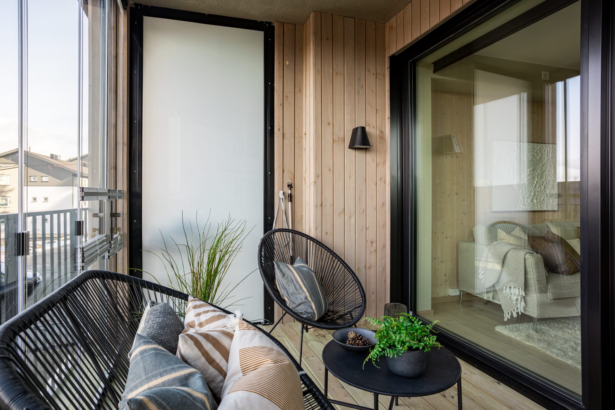 To leiligheter med felles stue, balkong og ekstra soverom. Leilighet A består av et soverom, bad og åpen stue / kjøkken. Leilighet B består av et soverom, bad og åpen stue / kjøkken med utgang til privat balkong. Begge leiligheter har låsbar dør inn til felles deleareal i midten når man ønsker privatliv.
