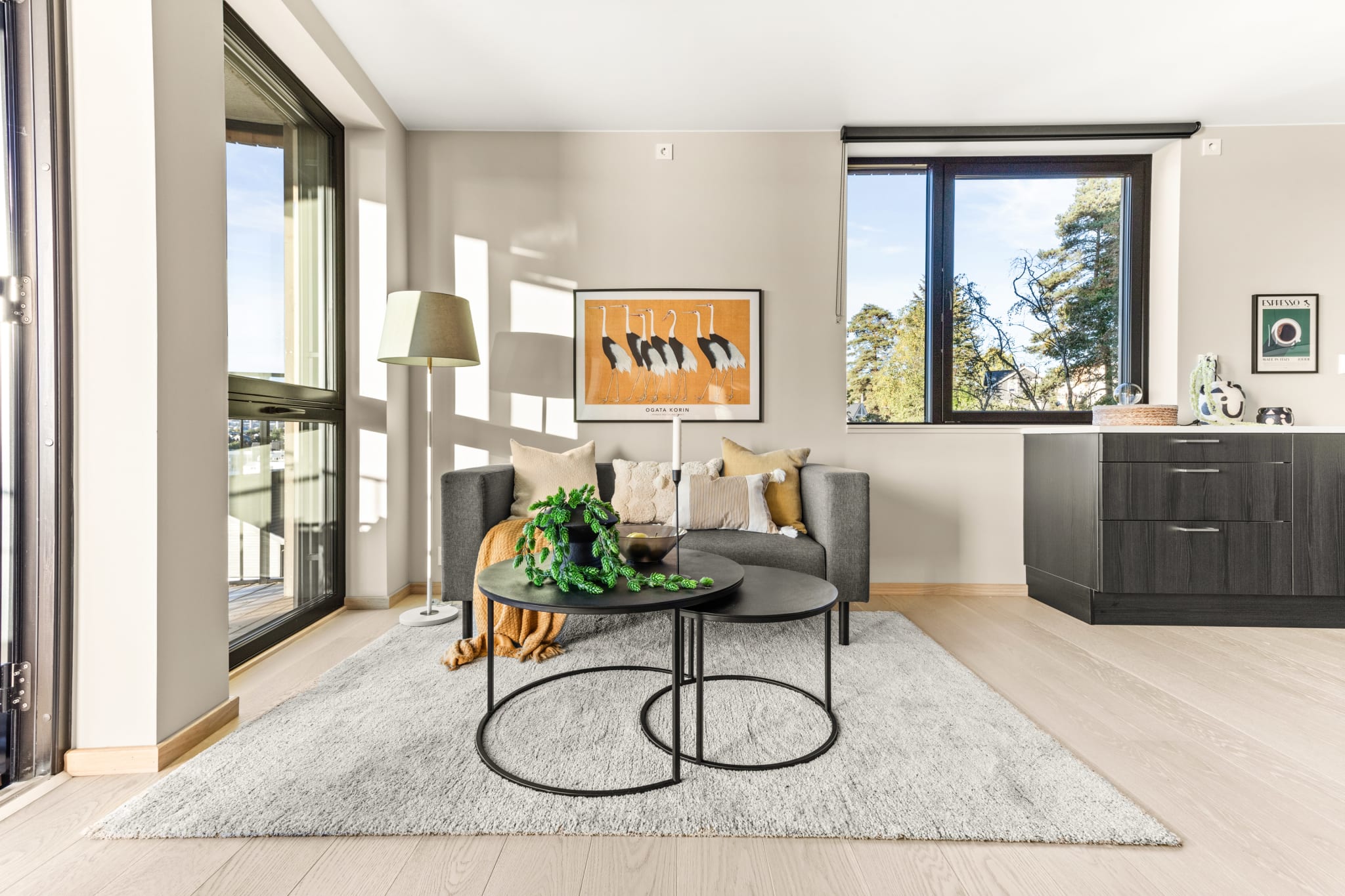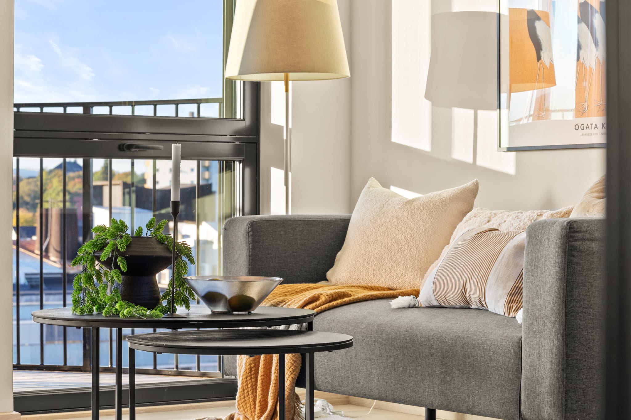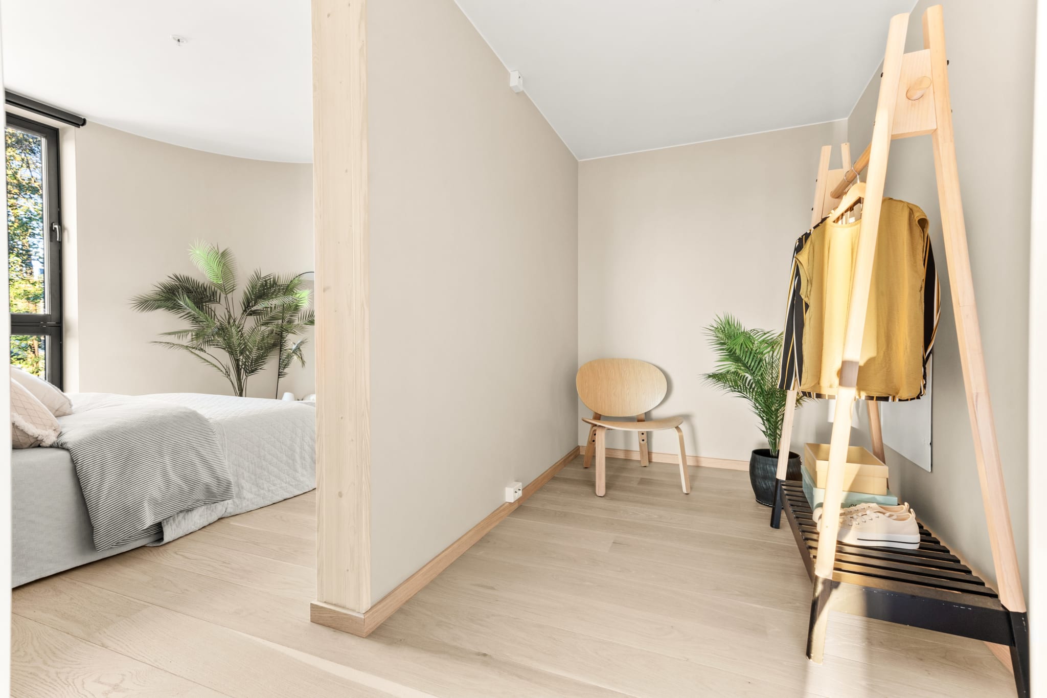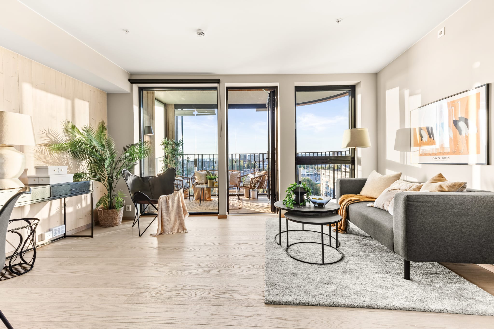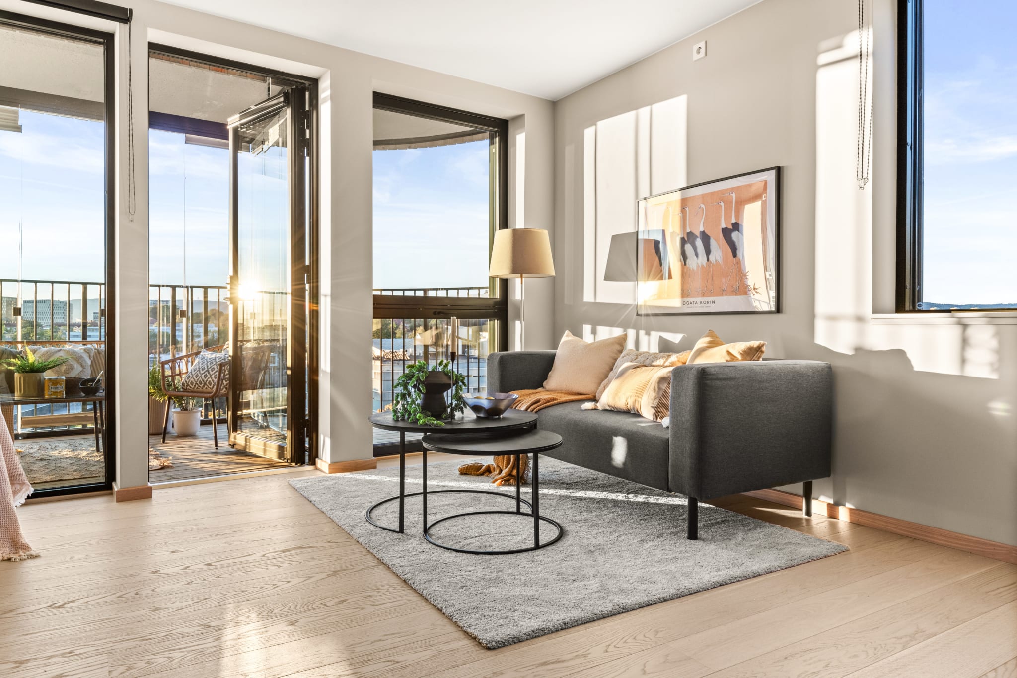 Leiligheten ligger på enden av bygget og gir masse lys og luft fra tre himmelretninger: