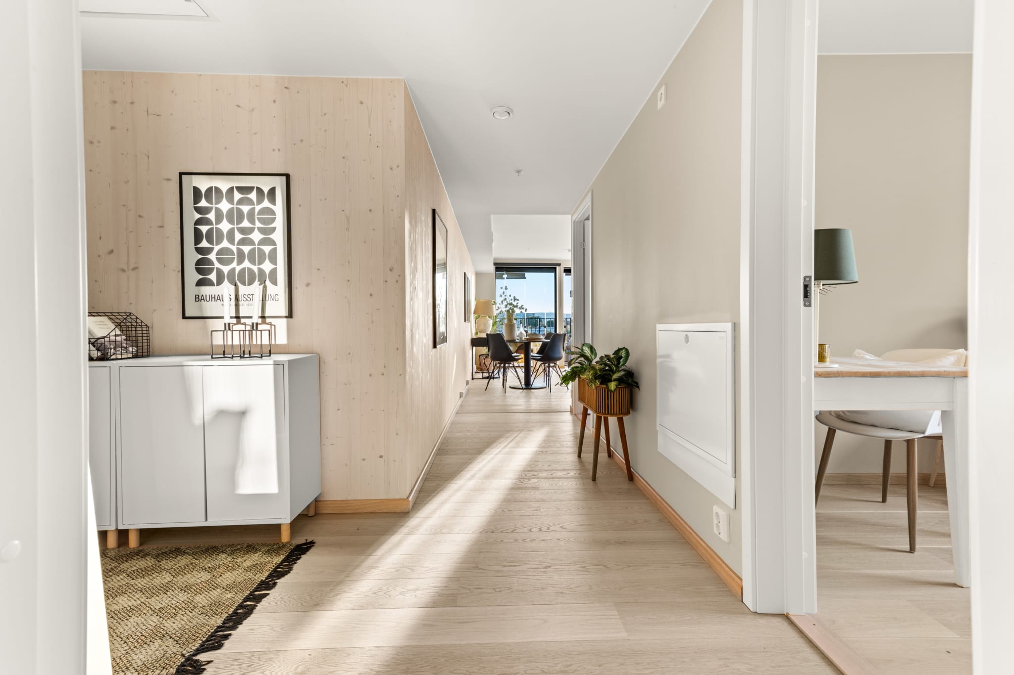 Effektiv 4-romsleilighet med sosial stue og kjøkken. Her kan du samle venner og familie, og om du trenger mer boltreplass er selskapslokalet en heistur unna!