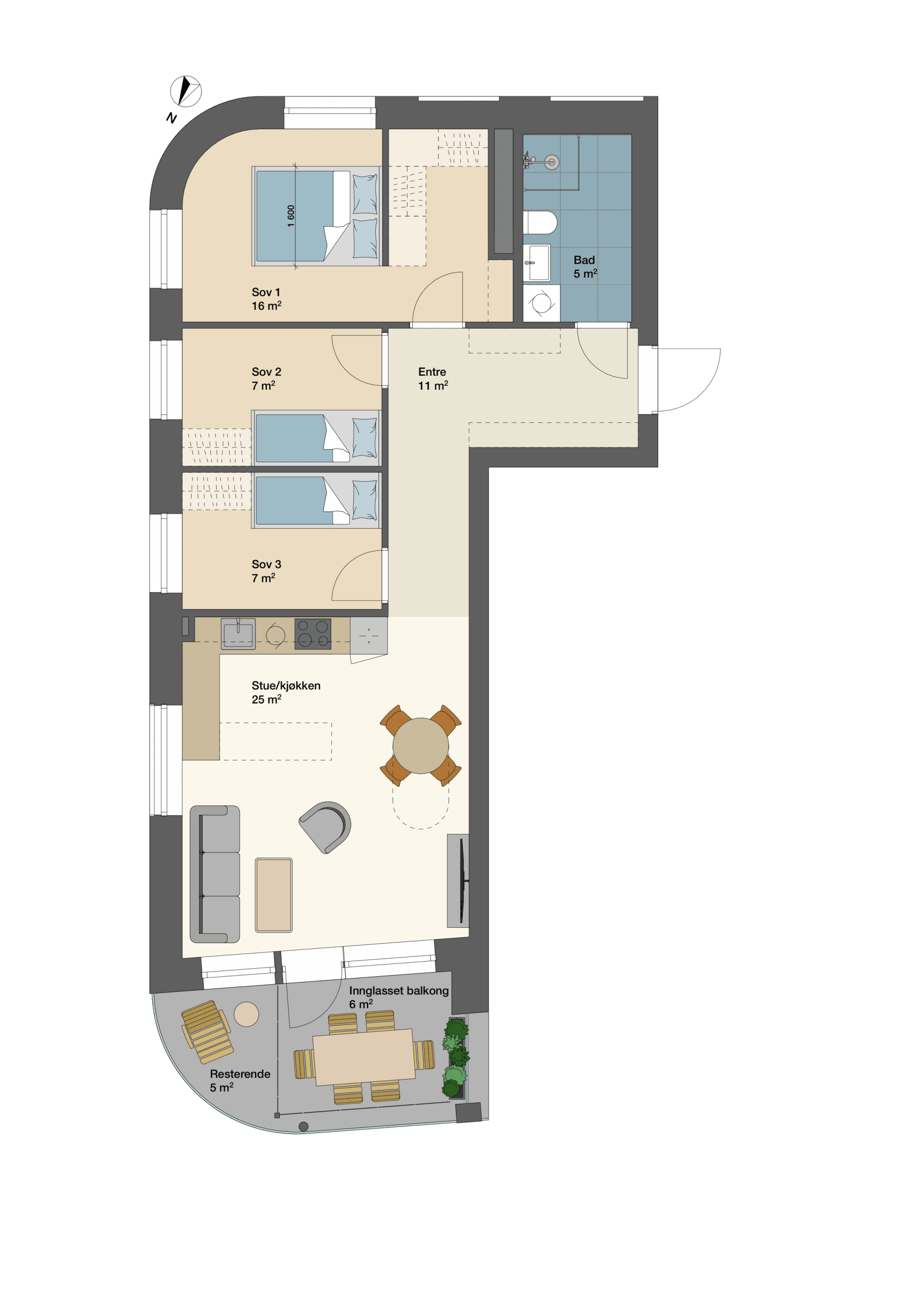 Effektiv 4-romsleilighet med sosial stue og kjøkken. Her kan du samle venner og familie, og om du trenger mer boltreplass er selskapslokalet en heistur unna!