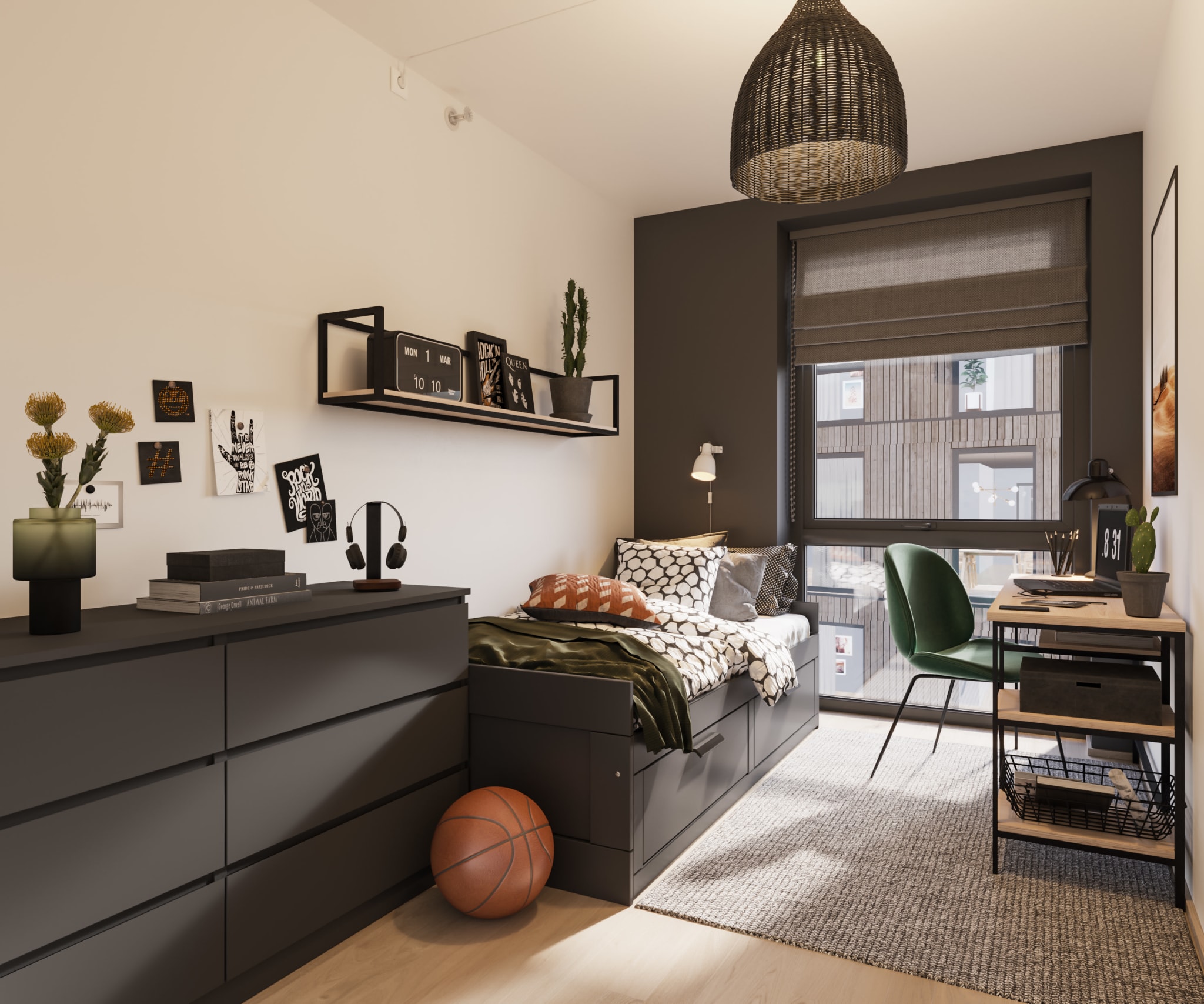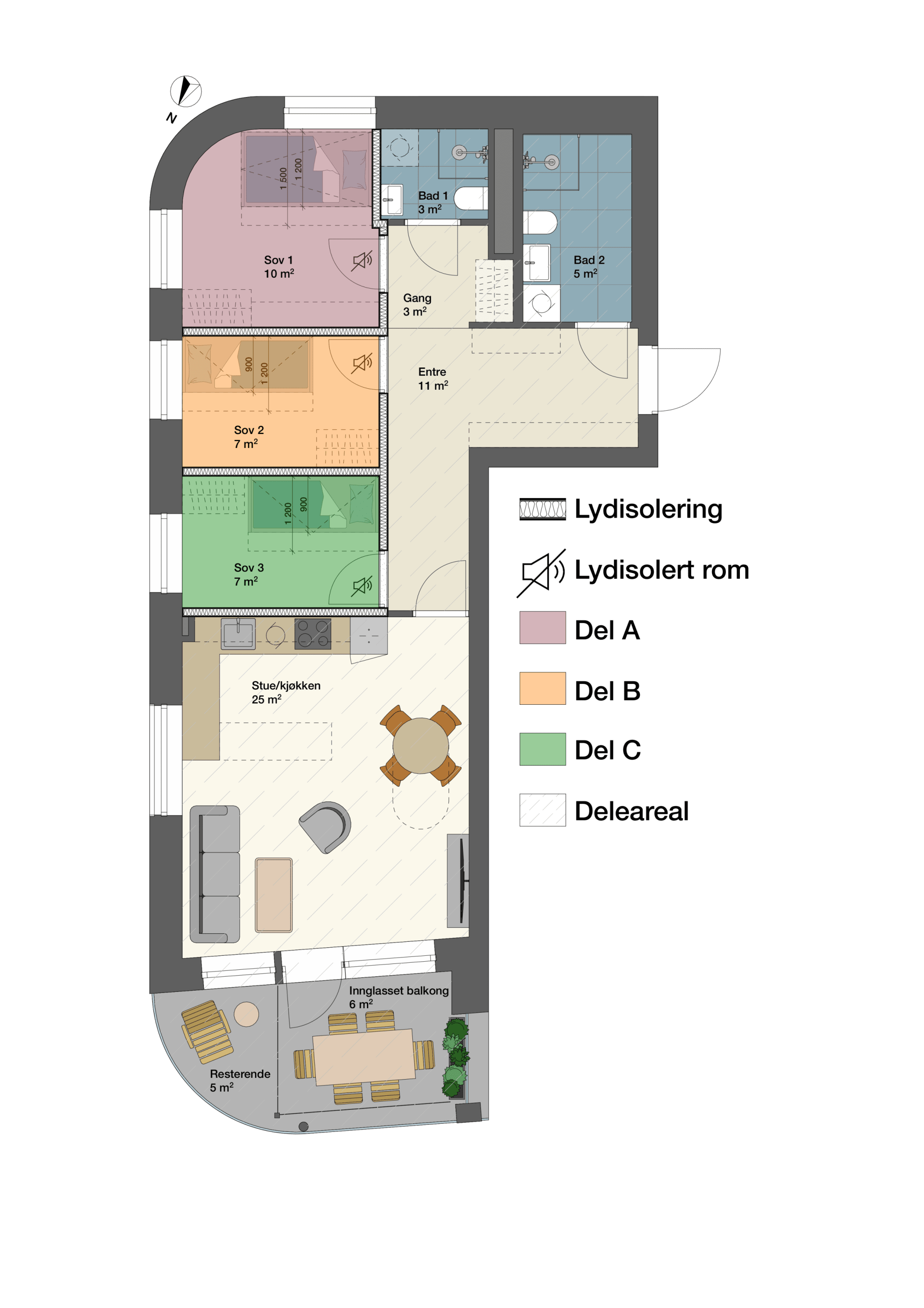 Inkluderer renter og avdrag på eget innskudd/lån, renter på fellesgjeld, oppvarming og fellesutgifter for år 1-5. Fra år 6 er også avdrag for fellesgjeld inkludert. Rentesats som er lagt til grunn er 1,54%. for fellesgjeld og 1,75% for eget lån. Løpetid for eget lån er satt til 25år.