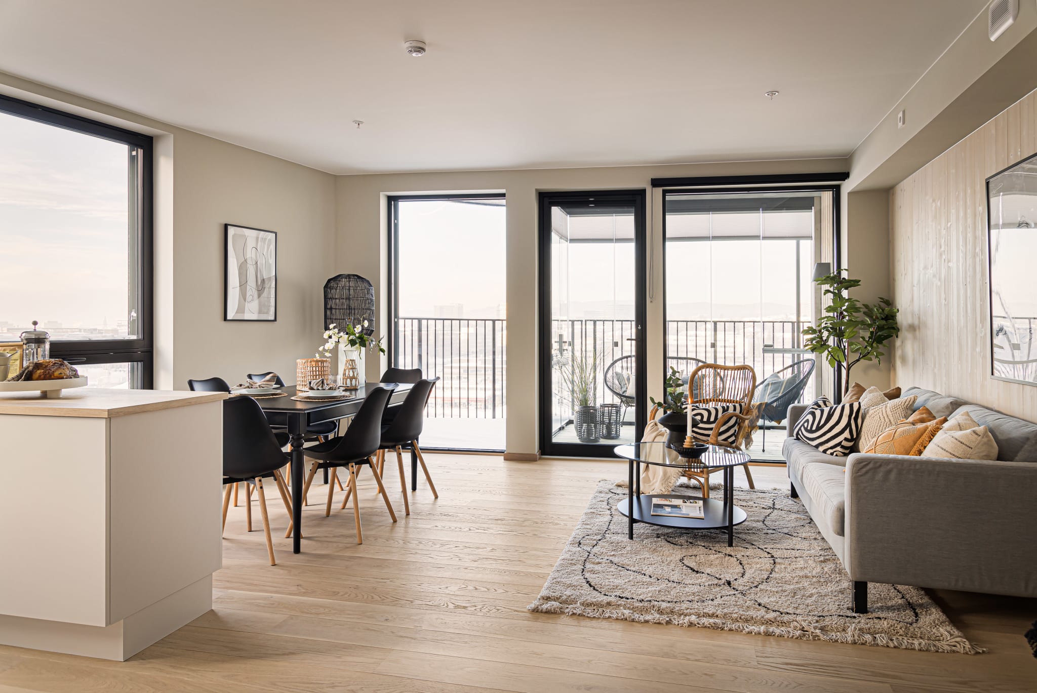 Leiligheten leveres med en helhetlig interiørstil - hvor rommene er satt sammen for å gi et avslappet og harmonisk hjem. Lys beige veggfarge i alle rom - og enkelte veggflater leveres med synlig massivtre som gir et lunt og godt inneklima. På badet leveres vegg og gulv med sandfarget fliser. Kjøkkenet er tidløst med hvite fronter med integrerte hvitevarer. 1-stav parkett m/ gulvvarme i oppholdsrom og bad.