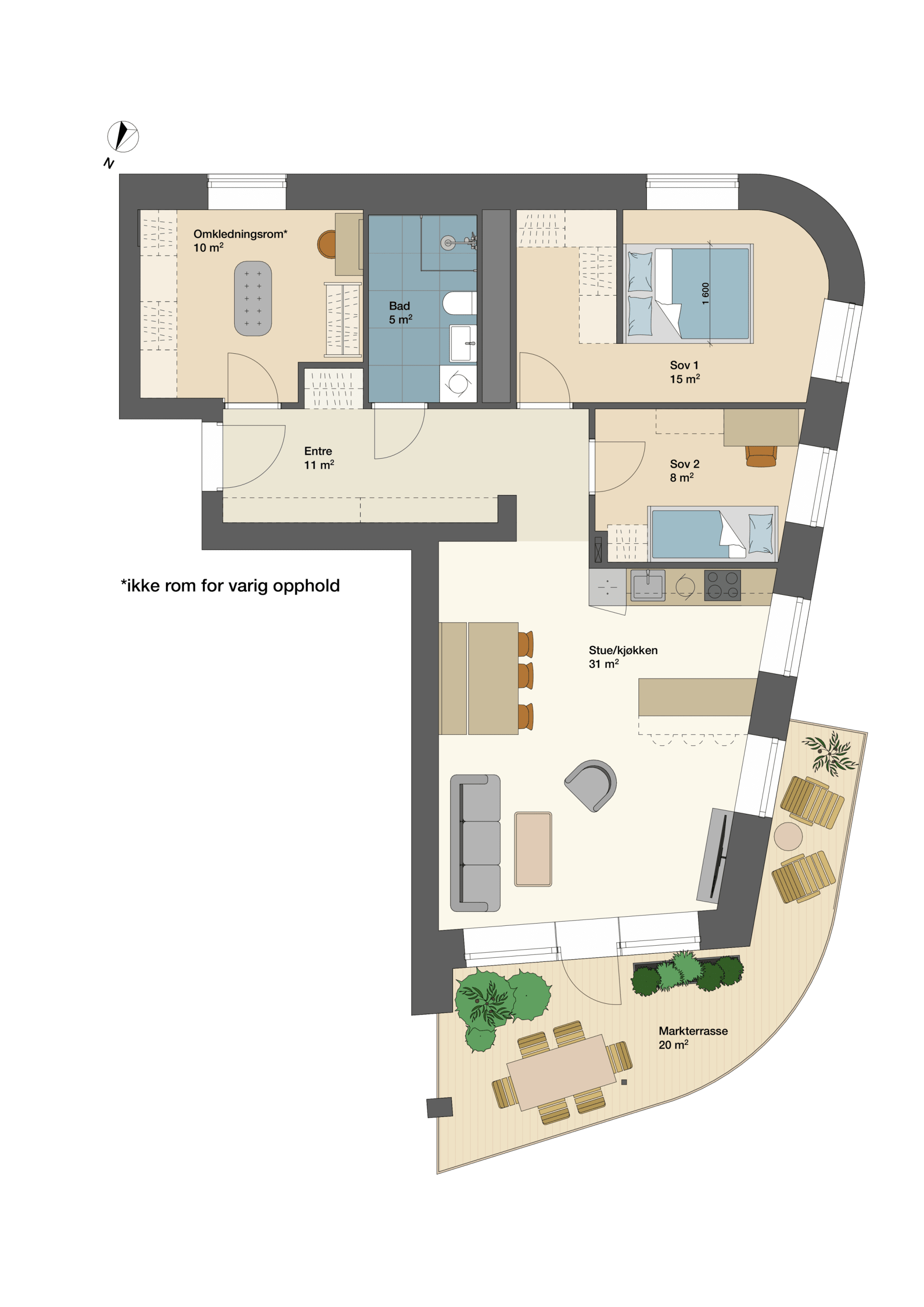 Leiligheten har åpen stue/kjøkkenløsning, ett bad, to soverom og stor garderobe. Utgang til markterrasse fra stua.