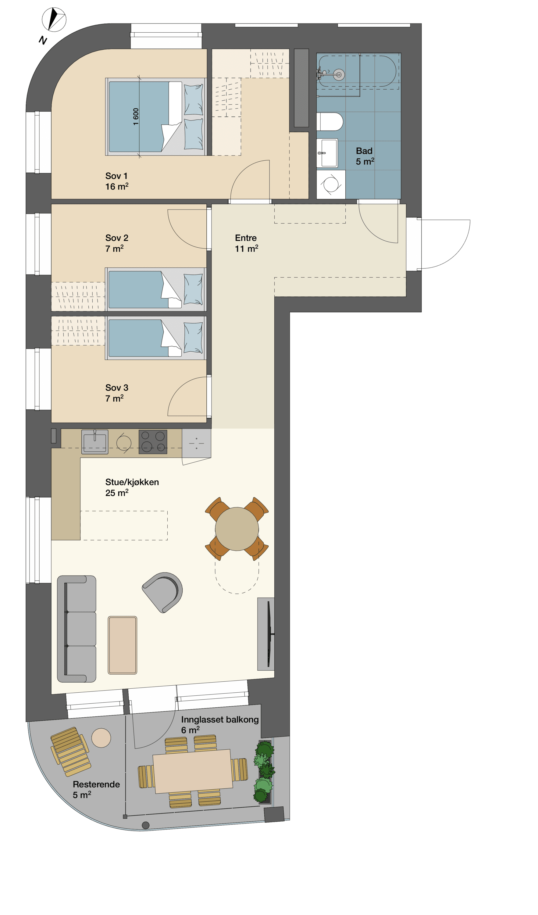En leilighet med åpen stue/kjøkkenløsning, ett stort og to mindre soverom og ett stort bad.