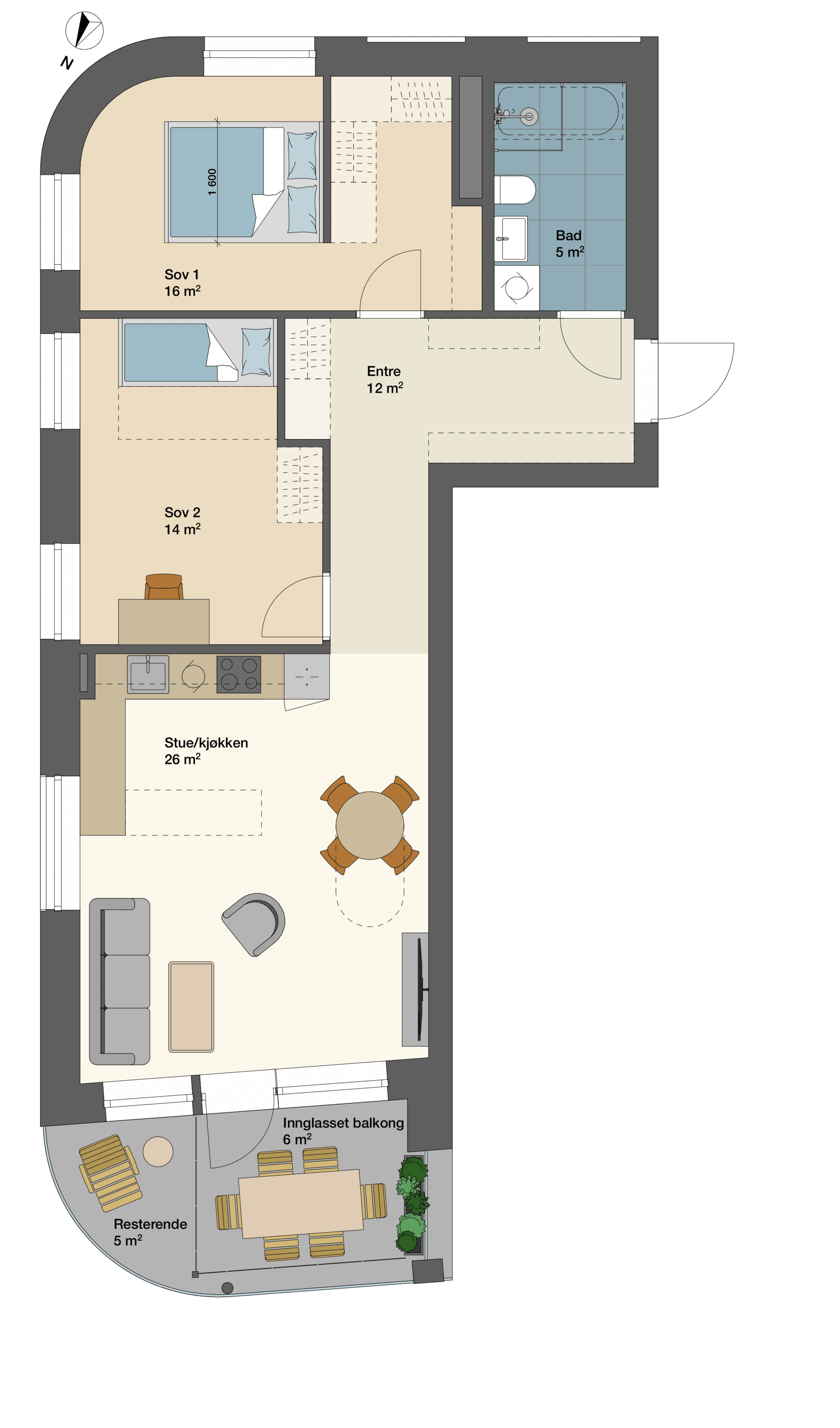 En leilighet med åpen stue/kjøkkenløsning og to store soverom.